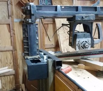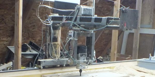 A radial arm saw (RAS) frame was cut down and mounted to the X-axis carriage. The saw itself provided a cheap and quick Z and Y axes and the motor could be easily adapted to hold a cutting bit. Another benefit of the RAS is that the motor could be rotated about two axes, turning the machine into a quasi 5 axis machine.