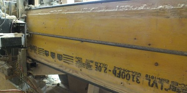 The X-axis rail consist of a large LVL beam, with 5/8" round steel bars and is mounted to the table which is constructed similar to a torsion box. A carriage was constructed from 2x2x1/8" steel tubing and uni-strut.